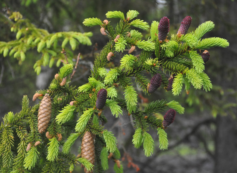 Верхушка ветви с молодыми шишками и побегами. Карелия, Ладожское озеро, остров Валаам. 19.06.2012.