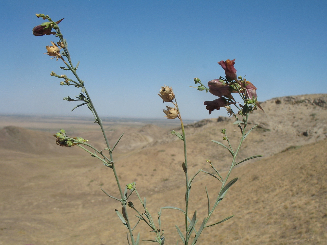 Верхушки ветвей с цветками, бутонами и плодами (приподняты; осеннее цветение). Южный Казахстан, Сырдарьинский Каратау, горы Улькунбурултау, ≈ 850 м н.у.м., степной склон сев. экспозиции. 15 сентября 2020 г.
