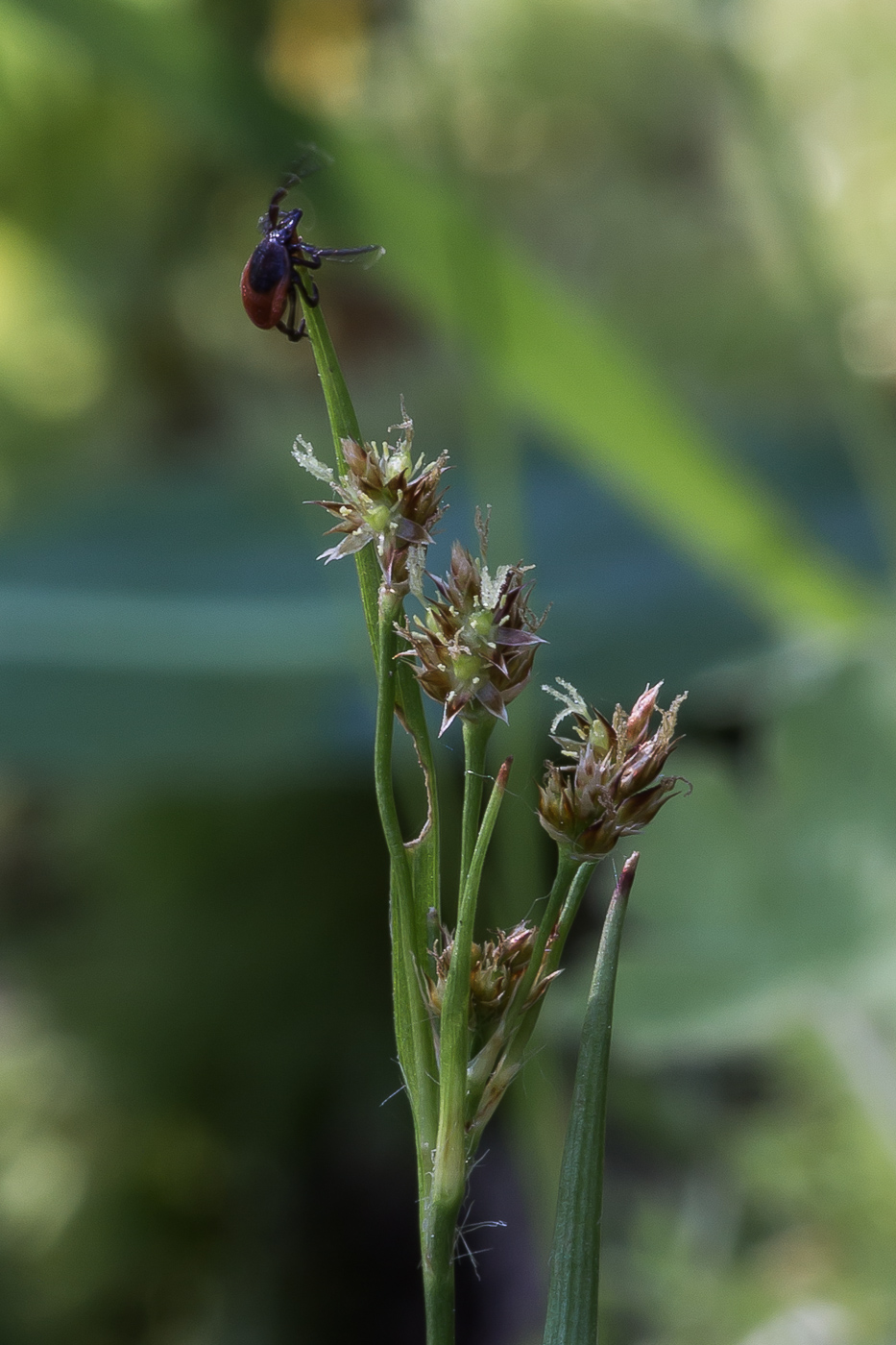 Верхушка цветущего растения с повреждённым листом и охотящимся клещом. Свердловская обл., окр. г. Заречный, урочище Черемшанское болото, берёзово-сосновый сырой лес, на противопожарной полосе. 09.06.2020.