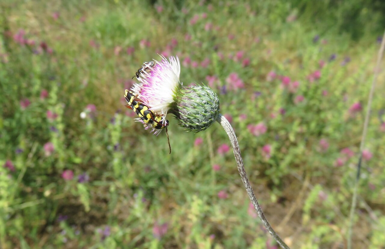 Верхушка побега с соцветием с кормящимся жуком и пчелой(?). Болгария, Благоевградская обл., община Сандански, к юго-западу от дер. Плоски, на силикатных песчаных почвах. 9 июня 2021 г.