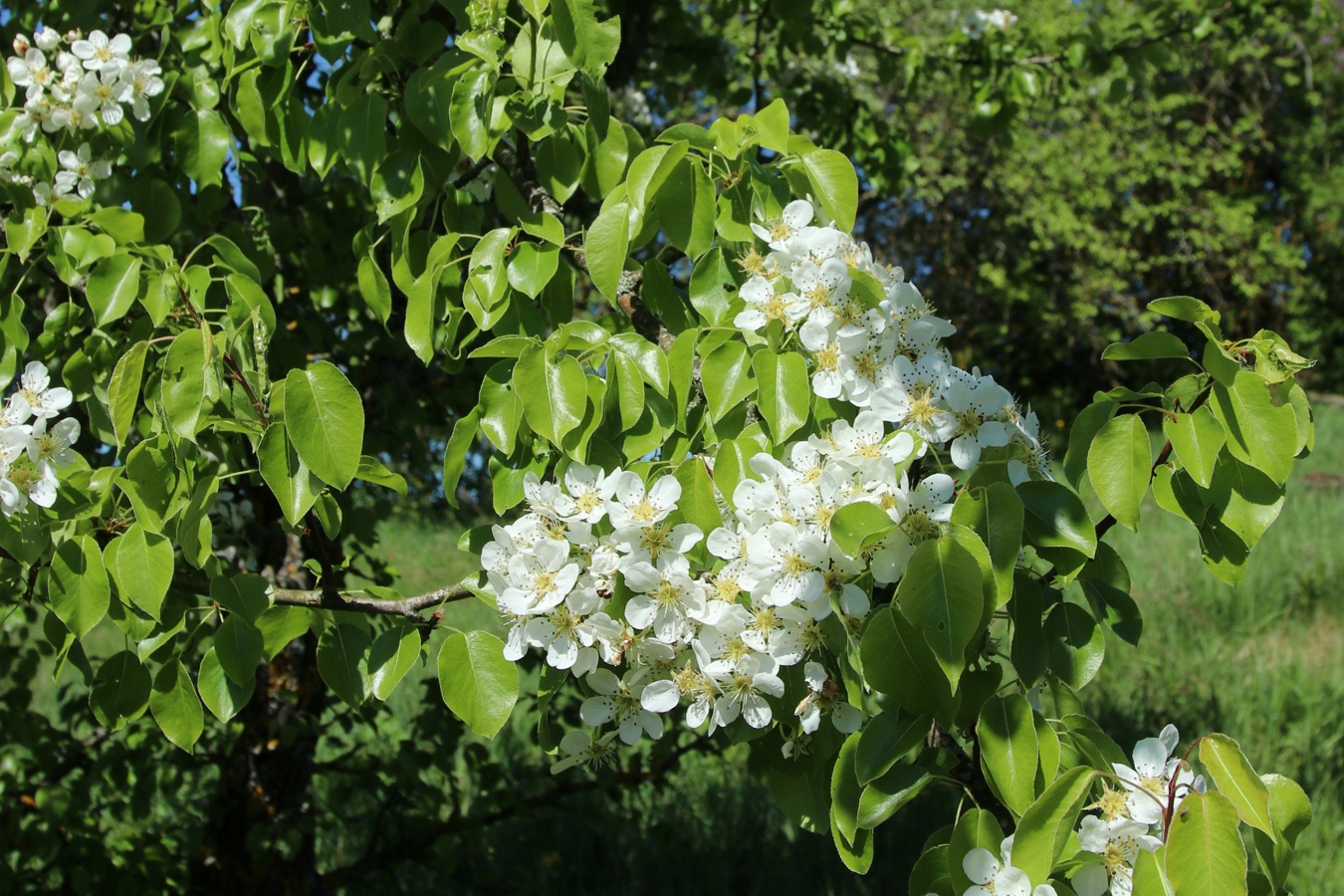 Часть цветущей ветви. Беларусь, Витебская обл., Лепельский р-н, агрогородок Камень, нижняя часть южн. склона горы Церковка, опушка рощи плодовых деревьев на суходольном лугу. 03.05.2024.