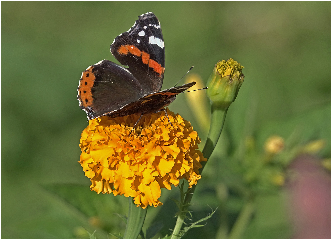 Соцветие (махровая форма) с питающейся бабочкой-адмиралом (Vanessa atalanta). Московская обл., Раменский р-н, окр. дер. Хрипань, садовый участок. 02.10.2020.