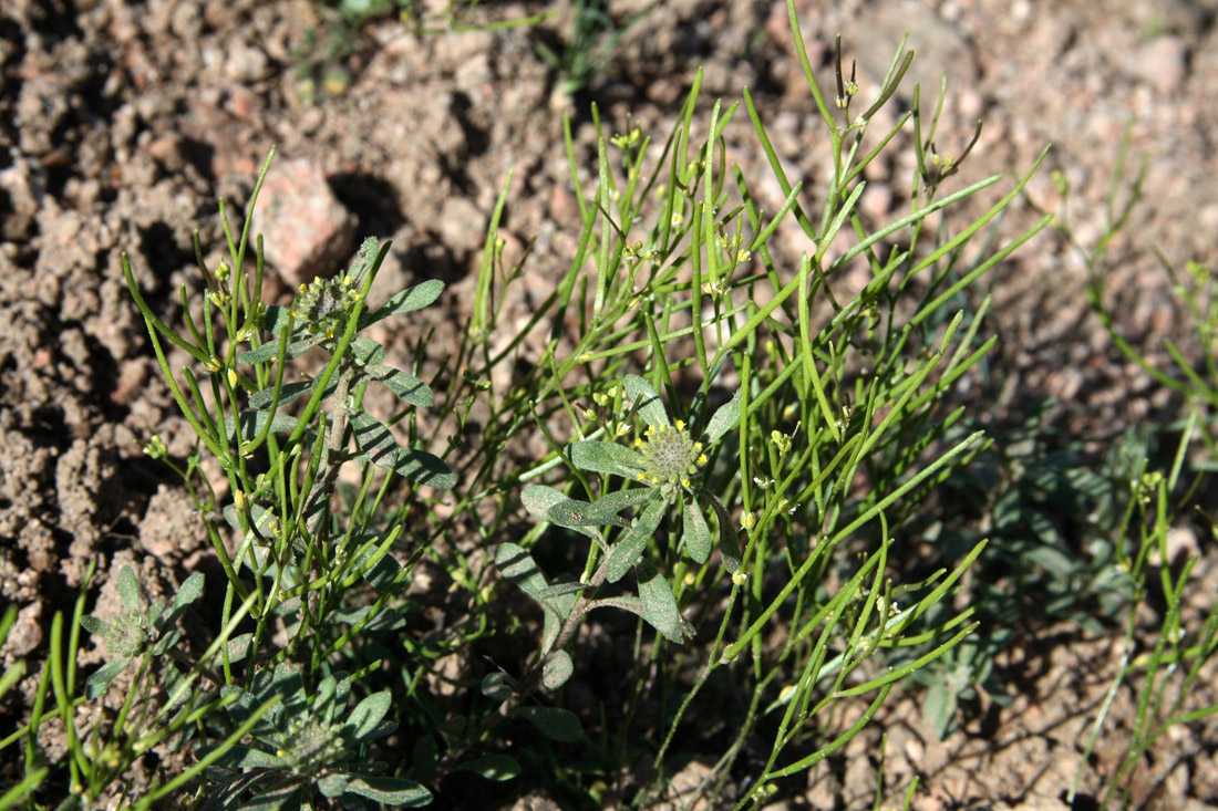 Растения с незрелыми плодами-стручками среди зацветающих бурачков (Alyssum simplex). Узбекистан, Ташкентская обл., зап. отроги Чаткальского хр., ур. Чимган. 01.05.2011.