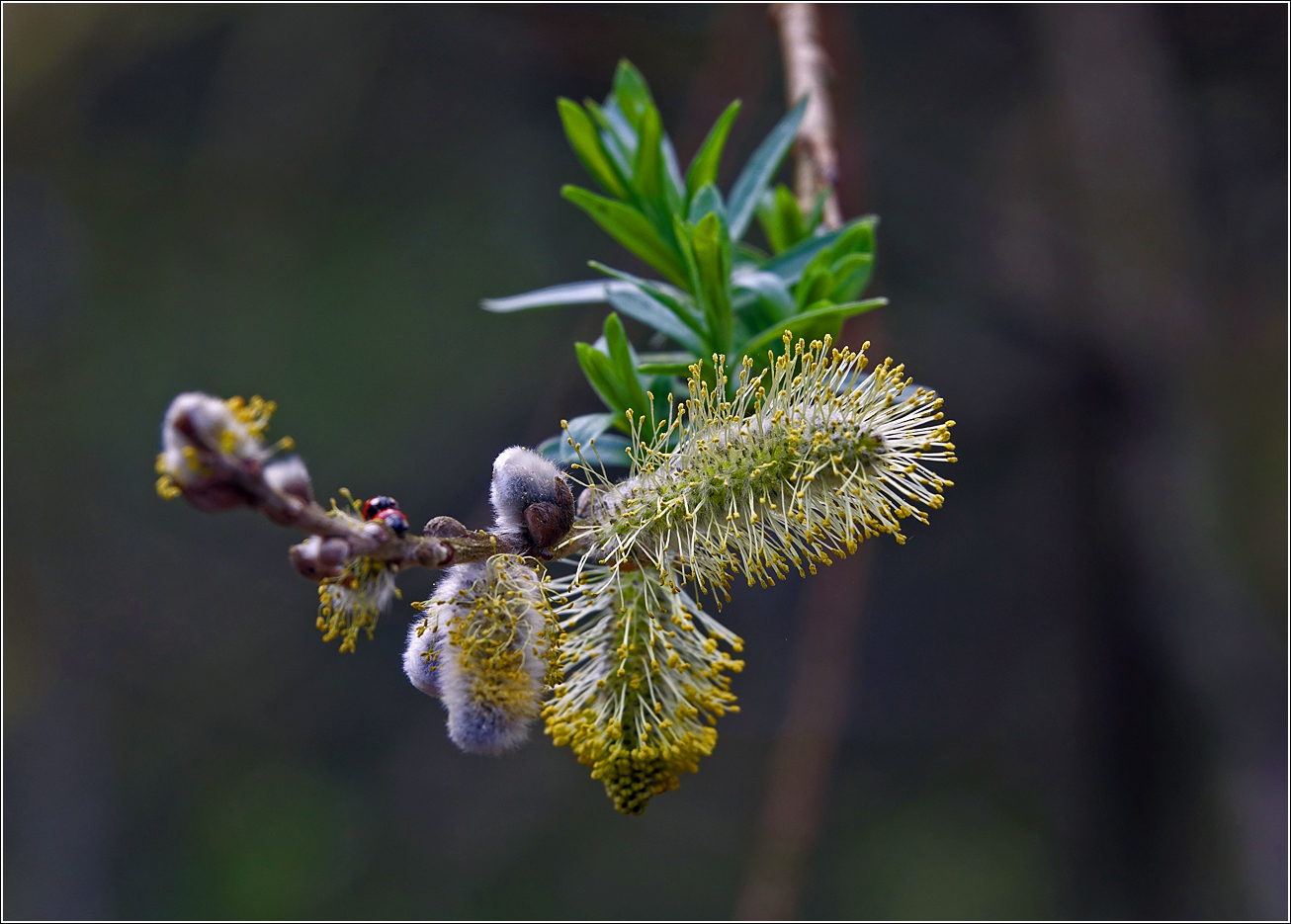 Верхушка побега с мужскими соцветиями, молодыми листьями и жуками — божьими коровками. Московская обл., Раменский р-н, окр. дер. Хрипань, садовый участок. 22.04.2025.