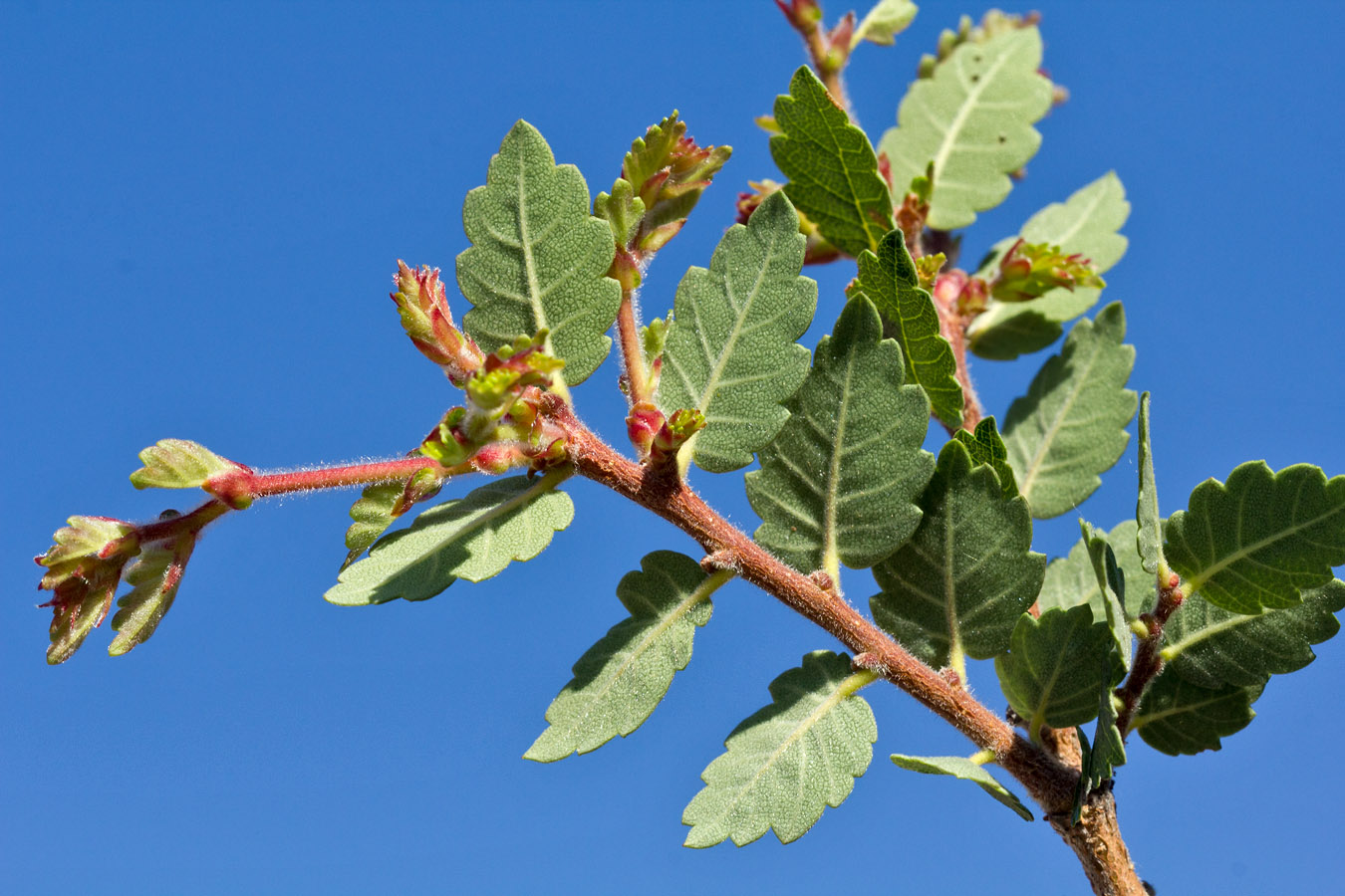 Верхушка веточки с развивающимися молодыми побегами (видна нижняя сторона листьев). Греция, о-в Крит, ном Ханья (Νομός Χανίων), дим Платаньяс (Δήμος Πλατανιά), горный массив Лефка Ори (Λευκά Όρη), урочище Ксилоскало (Ξυλόσκαλο), ≈ 1200 м н.у.м., на откосе автомобильной дороги. 23 июня 2017 г.