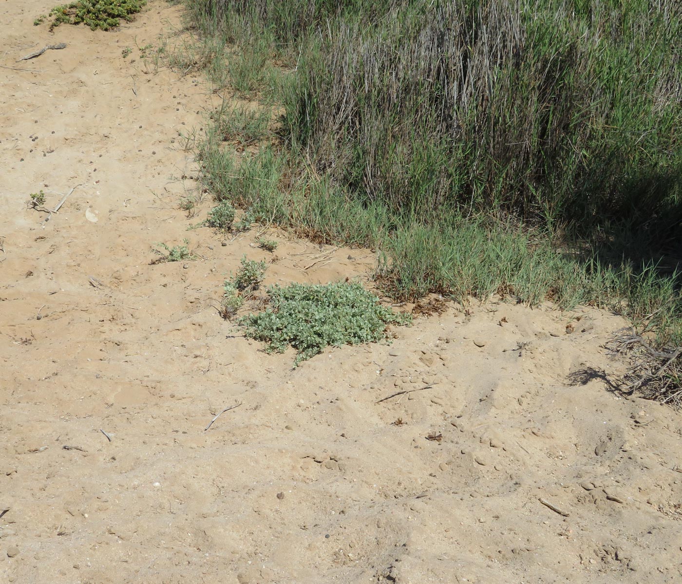 Вегетирующее растение (на заднем плане — Phragmites). Намибия, регион Erongo, южная граница г. Свакопмунд, пойма р. Свакоп. 05.03.2020.