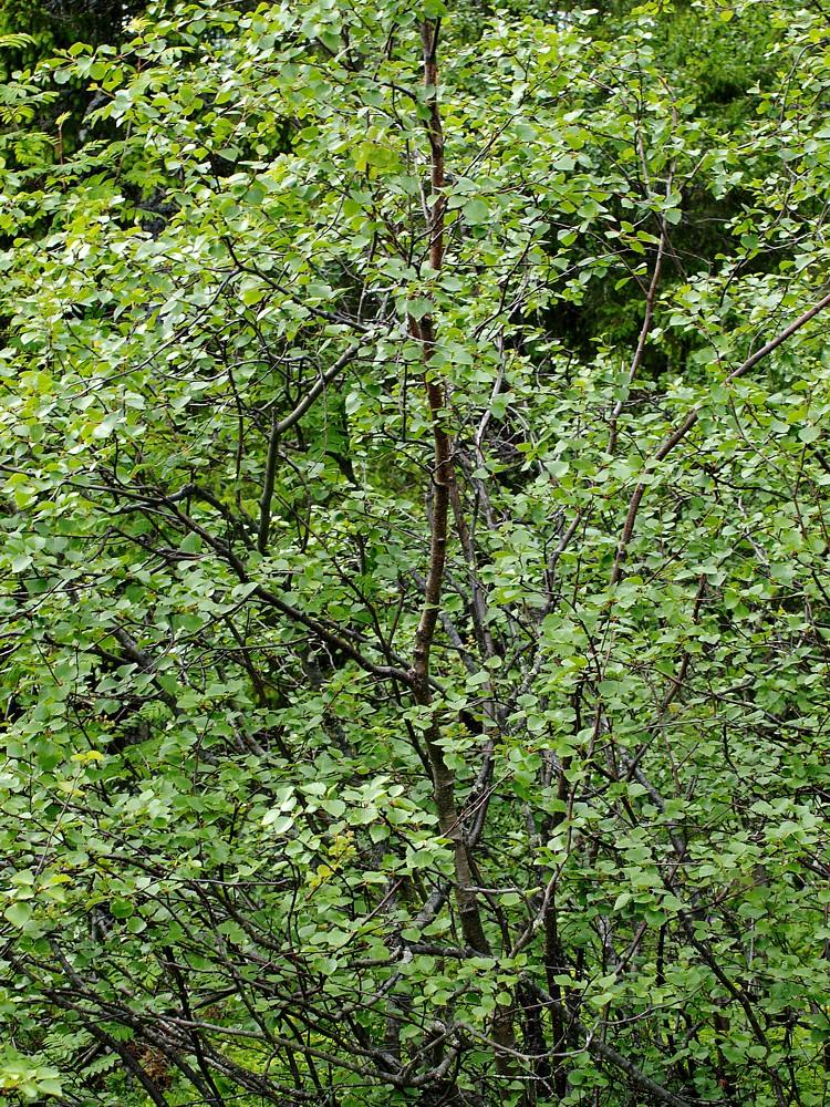 Ствол и часть кроны молодого дерева на склоне. Мурманская обл., Кандалакшский р-н, окр. пос. Лувеньга, южный склон гор Лувеньгские Тундры, пояс берёзового криволесья, 300 м н.у.м. 01.07.2010.