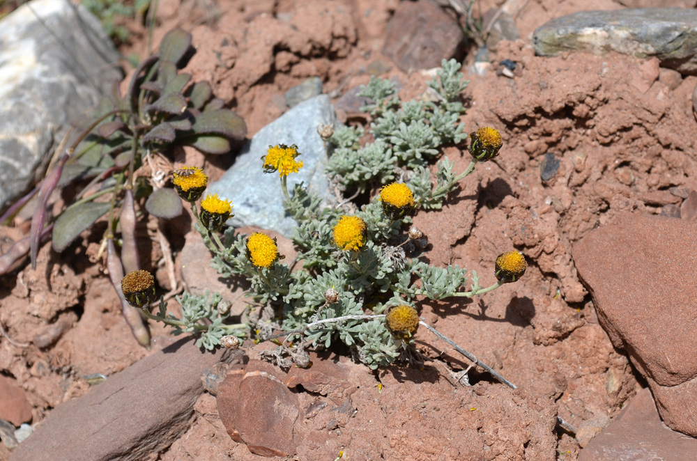 Цветущее растение в щебнисто-глинистом субстрате среди камней. Киргизия, Ошская обл, Заалайский хр., дорога на пер. Кызыл-Арт, около 4000 м н.у.м. 21 августа 2015 г.
