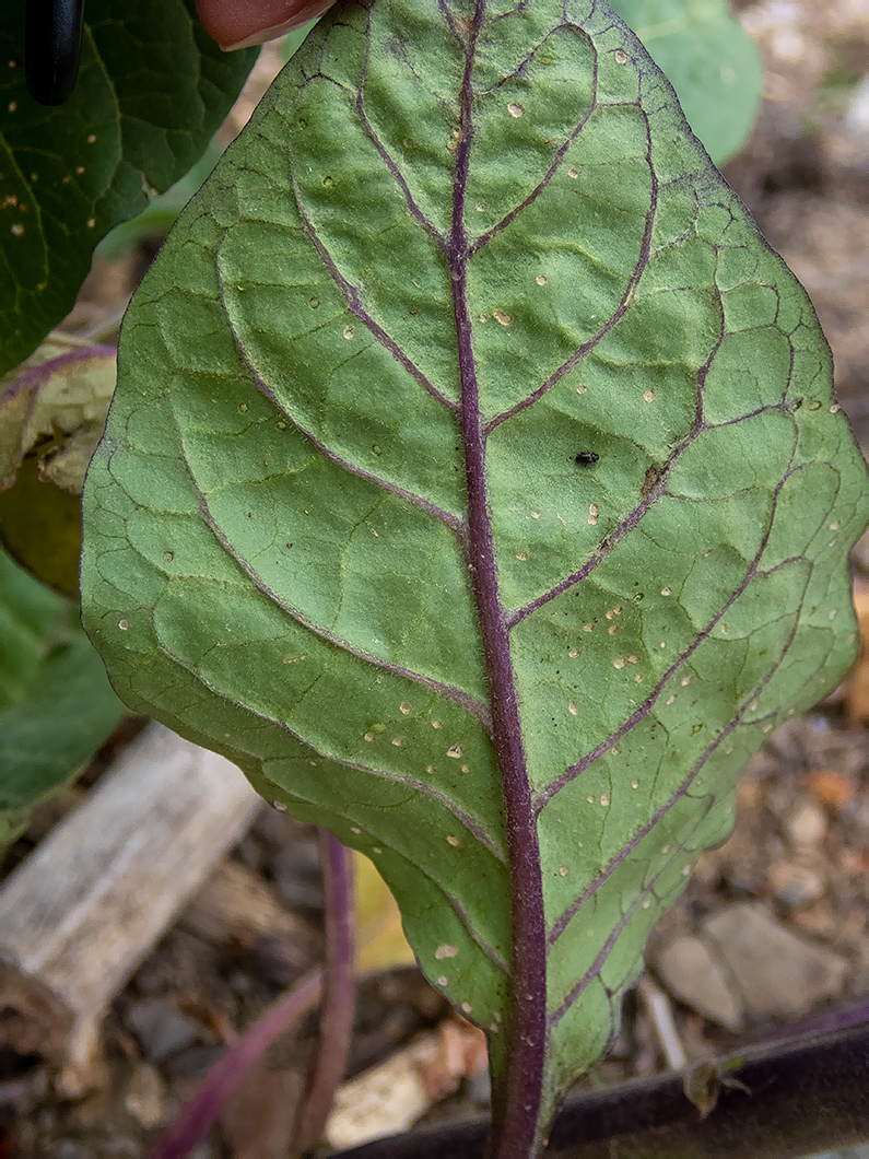 Лист с повреждениями и маленьким жуком (вид на абаксиальную поверхность). Крым, городской округ Алушта, окр. Ангарского перевала, просека под ЛЭП. 27.05.2024.