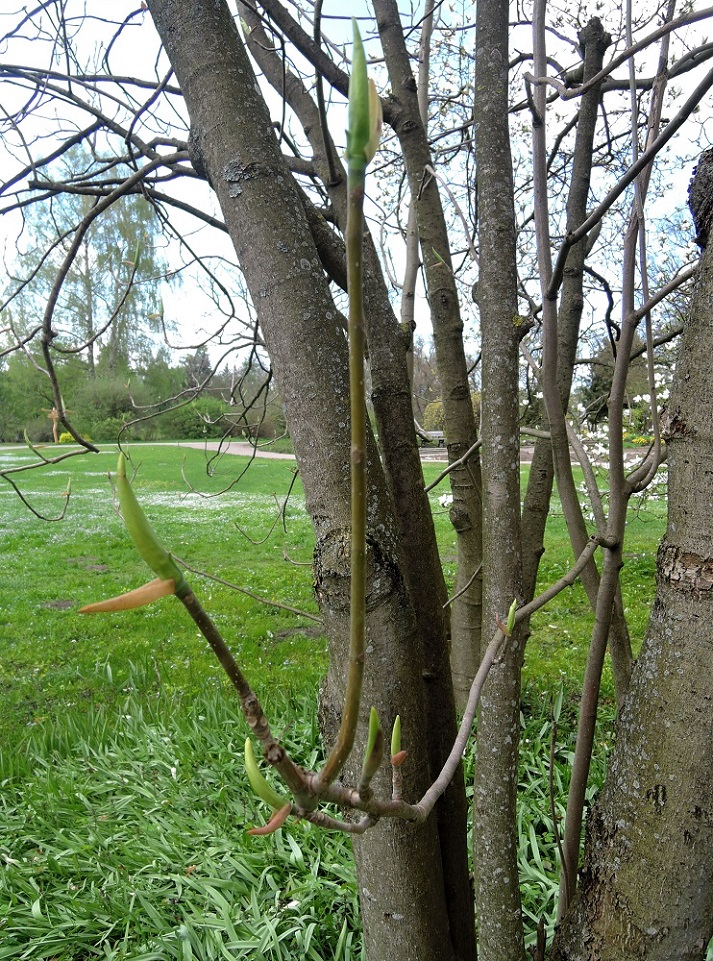 Ветка с разворачивающимися листьями. Латвия, Рига, Ботанический сад Латвийского университета, экспозиция магнолий (участок 1). 05.05.2015.