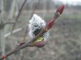 Salix caprea. Верхушка побега с распускающимся соцветием. Украина, г. Кривой Рог, Ботанический сад НАН Украины. 21.03.2009.