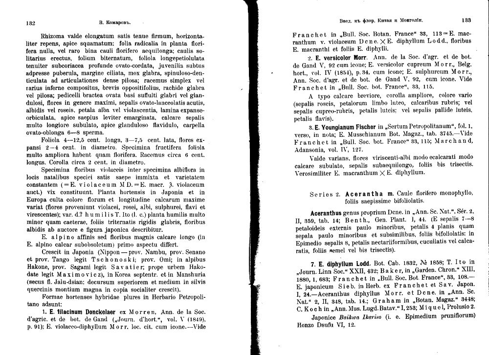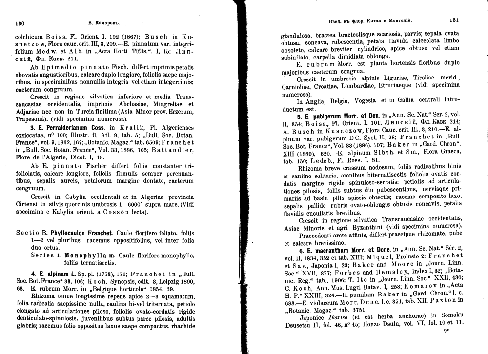 | Yuri Pirogov | Stearn, цитируя протолог E. koreanum, указывает на дваждытройчатые листья, тогда как Комаров во Флоре Маньчжурии пишет о тройчатых листьях E. macrantum Flora_Manshuriae.gif |