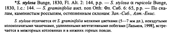 | Denis Mirin | Почему-то во Флоре Сибири такого вида (ни Silene karkaralensis, ни Silene stylosa) нет (и к Silene graminifolia нет примечаний). Если те 2 названия - синонимы, то Silene stylosa явно старше.