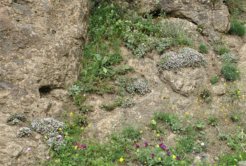Подушки цветущих растений на скале. Азербайджан, Талышские горы, Лерикский р-н, окр. с. Госмалян. 11.05.2012.