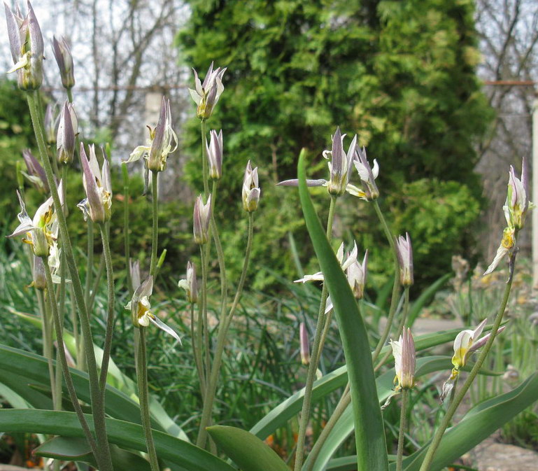 | Владимир Малибог | Да, растения из Голландии (судя по упаковке), куплены в Германии. Продаются под названием Tulipa turkestanica. В культуре достигают высоты 30-35 см, выше чем в описании Т. turkestanica и Т. bifloriformis. На цветоносах от 3 до 8 цветков, что более характерно для Т. bifloriformis. Большую часть цветения цветки прямостоячие (Т. turkestanica), а к концу цветения слегка поникающие (Т. bifloriformis). Луковицы с почти красными кроющими чешуями, без опушения (иногда со слегка заметными волосками). 2 прямых, расставленных листа, очень редко с волнистым краем. Цветки по описаниям подходят для обеих видов.