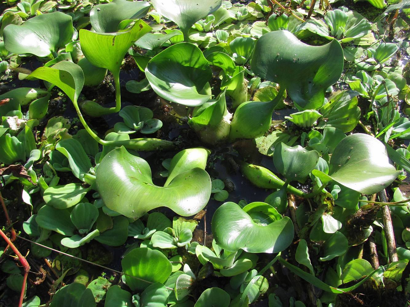 Плавающее на поверхности воды растение (крупные листья со вздутыми черешками) в сообществе с Pistia stratiotes. Томск, Университетское озеро (интродуцировано). 11.09.2012.
