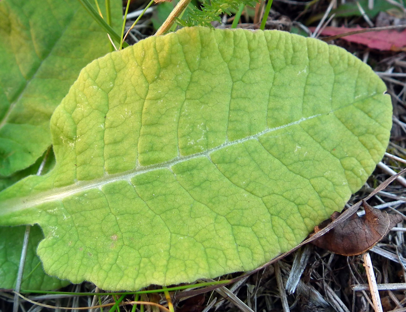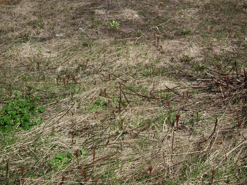 Сейчас это выглядит в ландшафте так - сухое спрессованное прошлогоднее сено с одиноко торчащим на заднем плане первоцветом. Рядом, в основном не в кадре, только молодая поросль манжеток и проростки иван-чая.