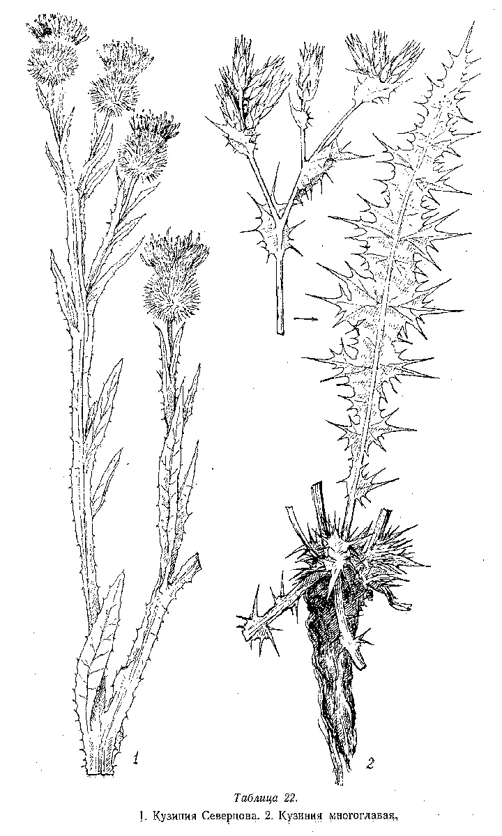 | Andriy Kovalchuk | У кузинии Боброва, судя по описанию во Флоре Туркмении, розовые венчики и около 40 цветков в корзинке (здесь - гораздо меньше), а у кузинии трёхглавой - корзинки крупные (с листочками обёртки - до 7 см в диаметре), расположенные одиночно на концах ветвей.