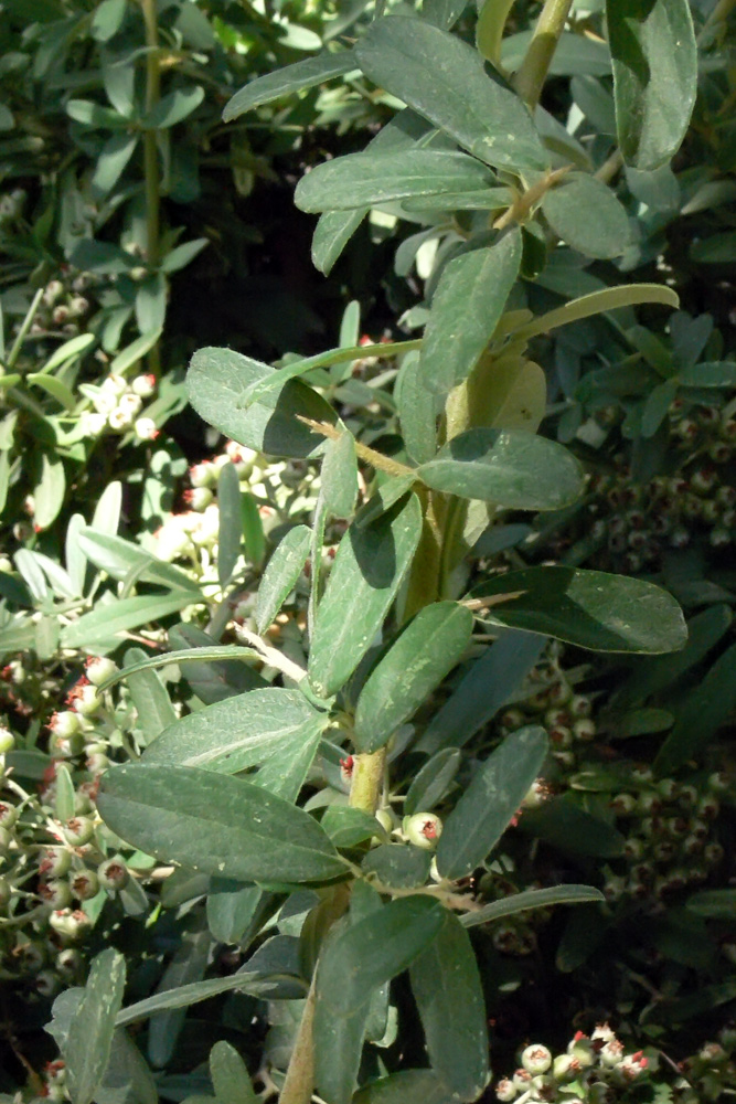 | Sergey Glotov | Наталья, видимо, права. Листья явно от Pyracantha angustifolia, ну, м.б. Pyracantha rogersiana. Просматриваются шипы:
