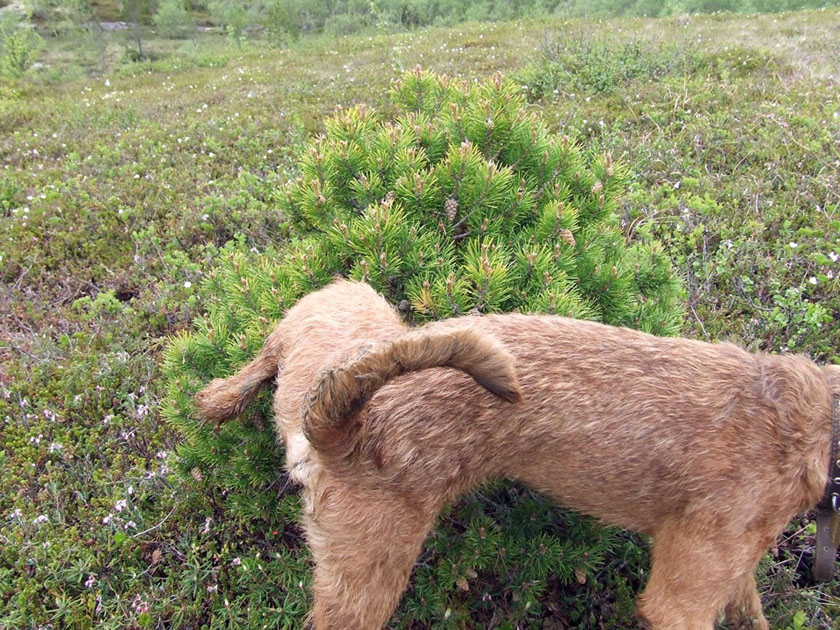 Обильно "плодоносящее" низкорослое растение в кустарничковой тундре (на заднем плане — ирландский терьер: высота в холке 45 см). Кольский п-ов, окр. пгт Росляково, берег губы Грязная Кольского залива. 04.05.2013.