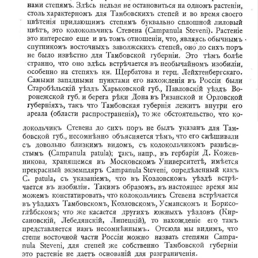 Во-вторых, если C. stevenii и C. altaica -- один вид, то все сходится. Интереснее то, что этого колокольчика нет в списке Литвинова. Но он в то время работал инспектором технического училища в Калуге, и изучению флоры мог уделять только отпускное время. Уже с середины июня этот вид не так уж и заметен. Это может быть причиной "недогляда" Литвинова.