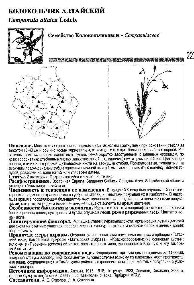 | Сергей Майоров | Во-первых, "Красная книга Тамбовской области" по части непрофессионализма впереди многих других на два корпуса. Во-вторых, если C. stevenii и C. altaica -- один вид, то все сходится. Интереснее то, что этого колокольчика нет в списке Литвинова. Но он в то время работал инспектором технического училища в Калуге, и изучению флоры мог уделять только отпускное время. Уже с середины июня этот вид не так уж и заметен. Это может быть причиной "недогляда" Литвинова. ![]() |