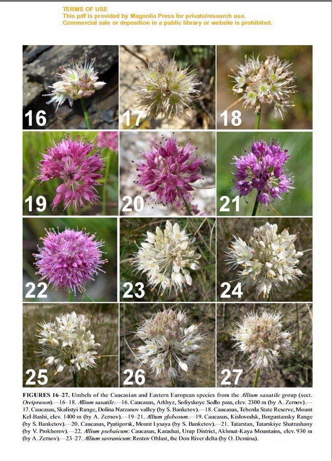 | Alexey Seregin | Растение на верхних фотографиях относится к западно-кавказскому низкогорному таксону, который я хотел описать как новый вид. В 2004 г. вышла работа Михеева, где он описал из этой группы Allium psebaicum (с гипсов Герпегема у Псебая). Чтобы не плодить названий, я предварительно отнес все образцы "своего" таксона к psebaicum, хотя действительно в протологе Михеева сказано про желтые пыльники. В Краснодарском крае у этого растения пыльники светло-коричневые (молодые пыльники, вскрытые фиолетовые не в счет). Я работаю сейчас с молекулярной систематикой этой группы, однако листьев с Герпегема я достать не смог. Резюме: пусть пока полежит как psebaicum. У меня возник, однако, другой вопрос: где точно снят белый лучок? неужели в той же популяции??? |