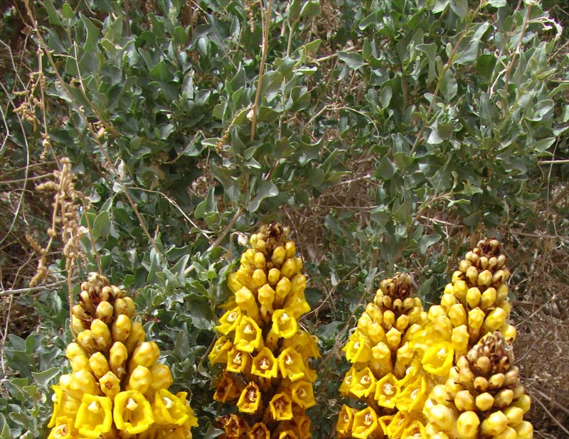 Отцветающие растения, паразитирующие на корнях Atriplex halimus. Израиль, обочина трассы Арад — Мёртвое море. 18.03.2014.