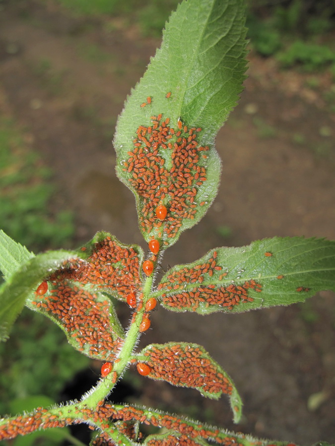 Нижняя поверхность листа с колонией тлей. Владивосток, Ботанический сад-институт ДВО РАН. 9 мая 2014 г.