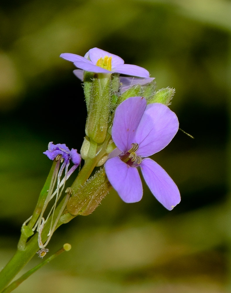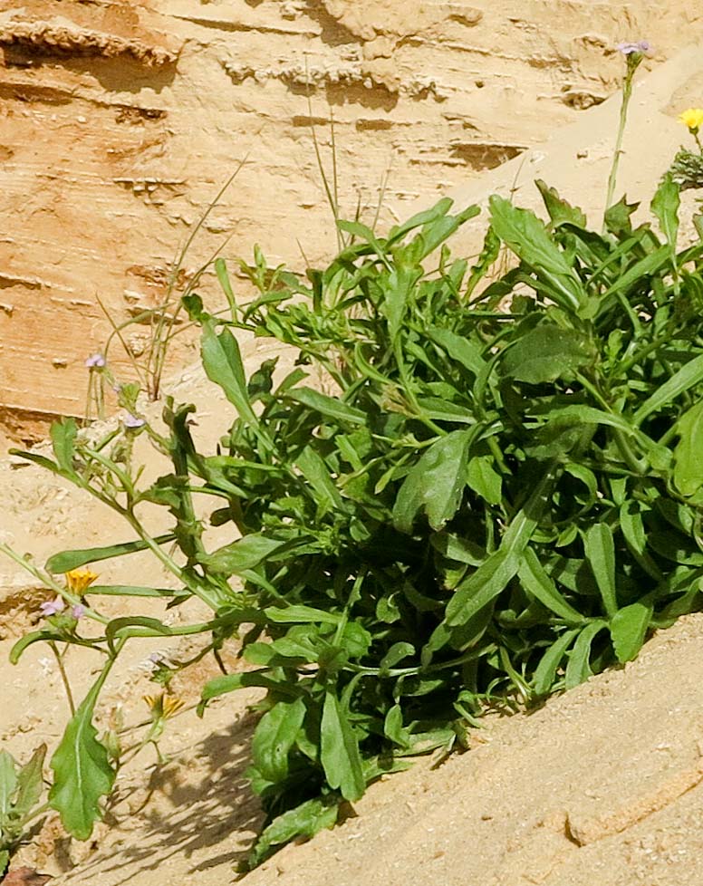 | Tatiana Malchinski | Может, Erucaria hispanica случайно попала с осыпью (на песке она не растёт)? У неё бывает такое опушение. Но никогда не видела у неё таких листьев. И в определителе сказано однозначно, что листья разрезанные, без всяких вариантов. В окрестности на несколько километров вокруг не встречала никаких других крестоцветных с лиловыми цветками.