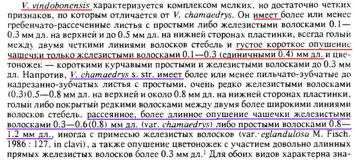 | Aleksandr Ebel | Просто попытайтесь ещё раз внимательно прочитать упомянутую в другом обсуждении статью А.Н. Сенникова (особенно абзац, где сформулированы отличия по качественным признакам). Степень опушения - это признак всё же количественный (впрочем, для V. chamaedrys s. str. характерно именно рассеянное опушение чашечки). Про опушение прицветников я в этой статье ничего не нашёл. Но там же указано, что в России восточный предел распространения V. vindobonensis проходит в Оренбургской области. Информации о находках этого вида в Средней Азии - Казахстане там тоже нет.