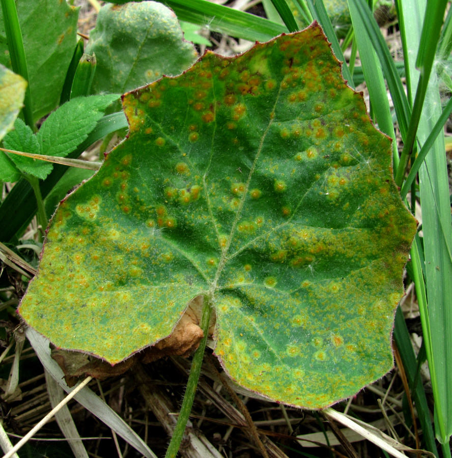 Лист, поражённый ржавчинным грибом. Окр. Архангельска, свалка древесных отходов. 08.06.2014.