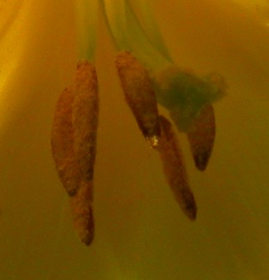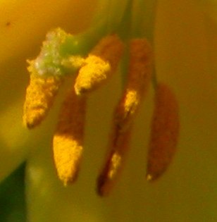 Околоцветник золотисто-жёлтый. Листочки околоцветника ланцетные или продолговато-ланцетные, на верхушке оттянутые и заострённые, 1,5-2 см шириной. Пыльца золотисто-жёлтая или тёмно-желтая, зелёные или бурые стенки пыльников и зелёное или по краю сиреневатое рыльце. Тычинки часто сросшиеся.