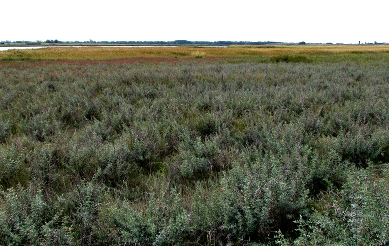 Зрелые бобы на ветвях в нижней части кустарника. Казахстан, Павлодарская обл., правый берег Иртыша в 50 км выше Павлодара, окр. с. Ямышево, восточный берег безымянного пресного озера с зарегулированным стоком в Иртыш; монодоминантный гемигалофитный пояс чингиля (Hemihalofruticetum=Halimodendronetum) на гидроморфном луговом солончаке в озёрной котловине. 10 сентября 2014 г.