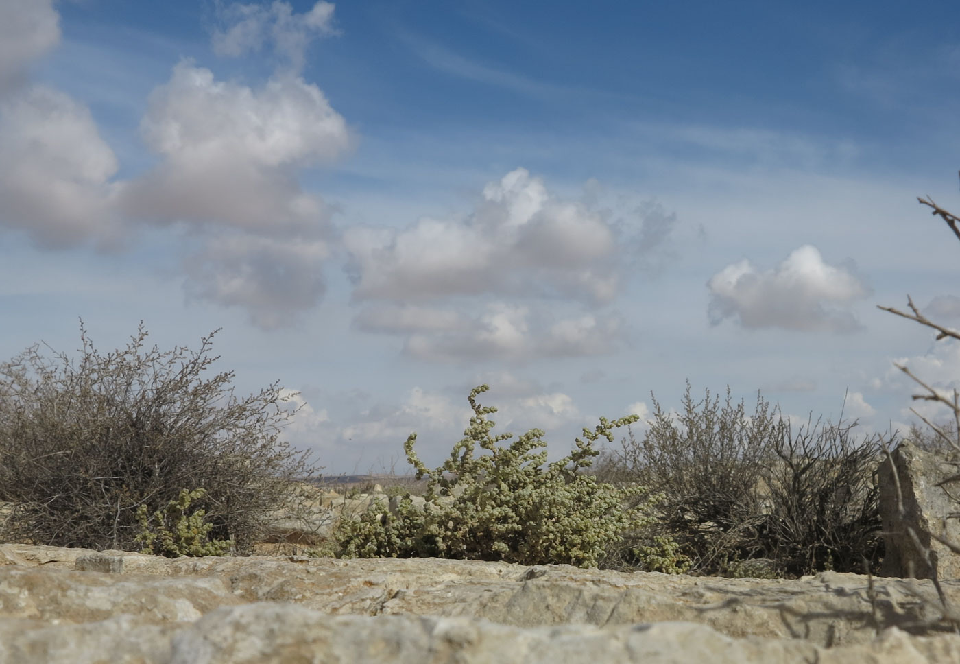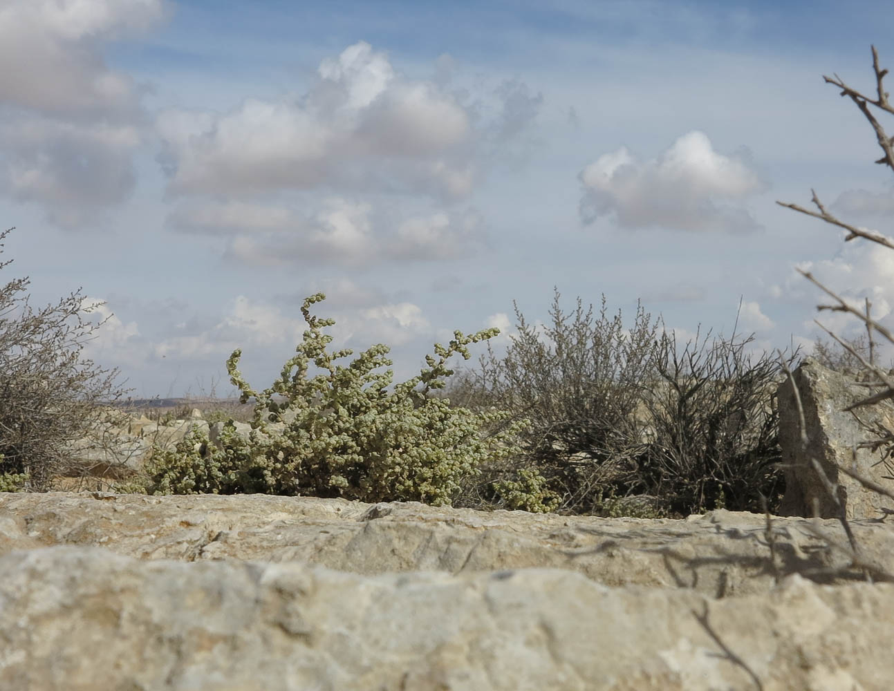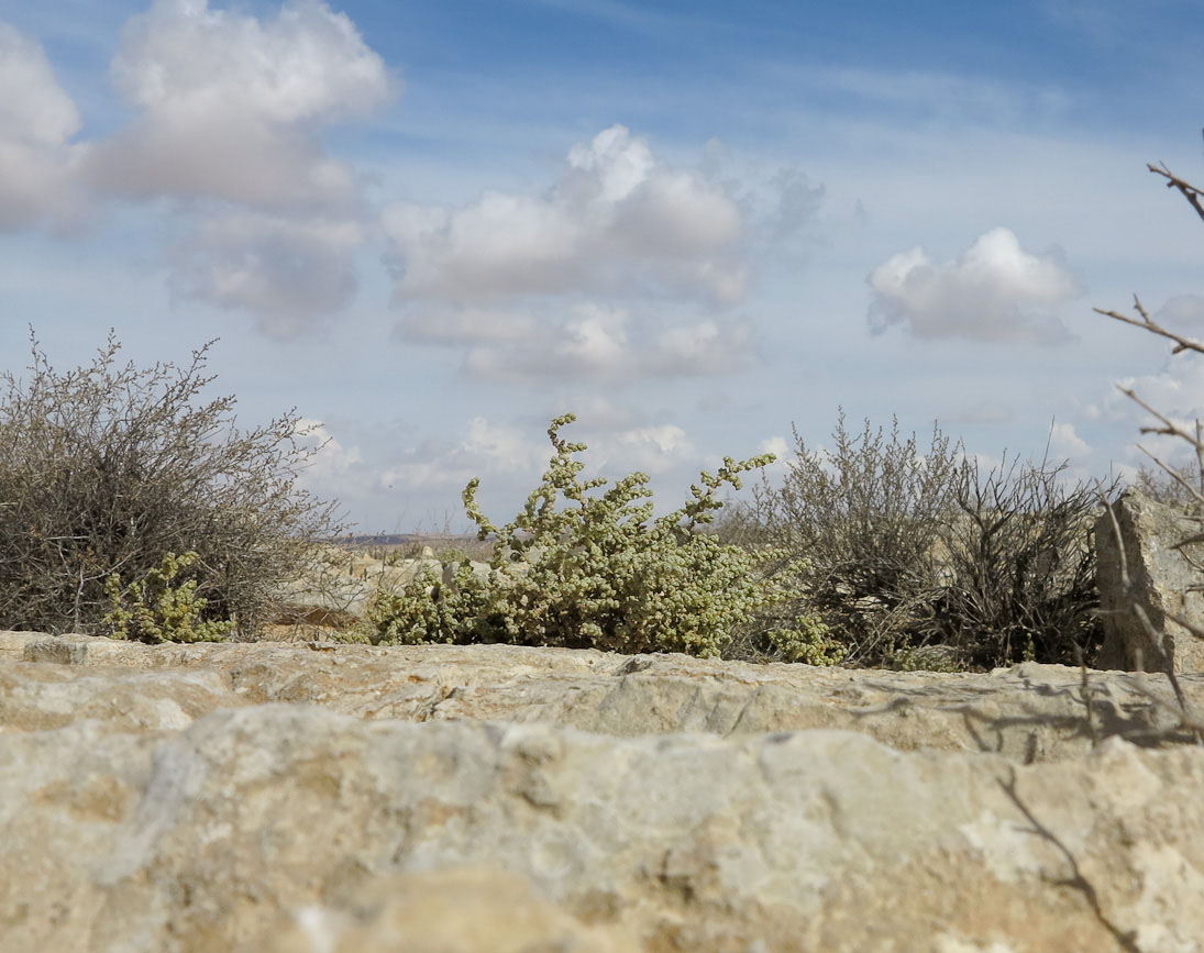 Плодоносящие растения у основания каменной плиты на гребне горного отрога; кусты справа и слева — Artemisia sieberi. Израиль, нагорье Негев, окр. киббуца Сде Бокер. 27.10.2015.