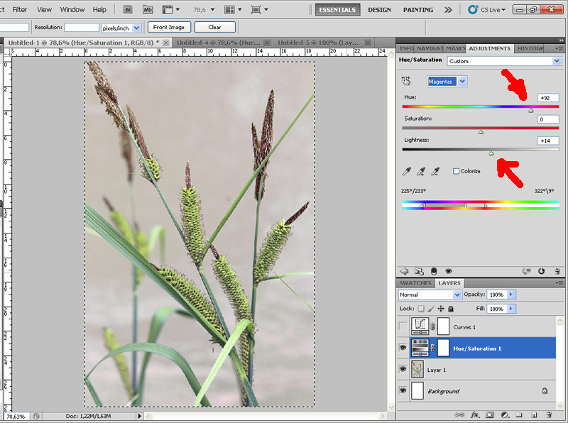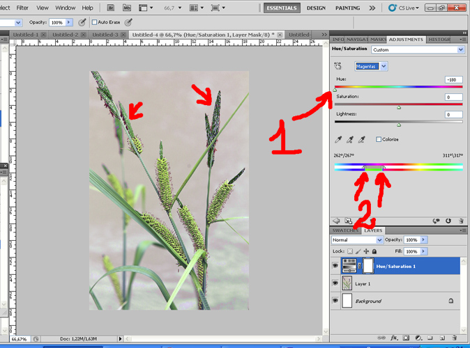 Создать корректирующий слой Hue/Saturation (1) и выбрать тот диапазон, который хочется изменить (в данном случае — маджента) (2).