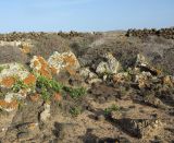 Цветущие и плодоносящие растения между камней и в углублениях на камнях; на заднем плане — Suaeda vermiculata. Испания, автономное сообщество Канарские острова, остров Фуэртэвентура, провинция Лас Пальмас, муниципалитет Ла Олива, восточные окр. пос. Эль Котильо, предгорная равнина, рудеральное местообитание. 16.03.2016.