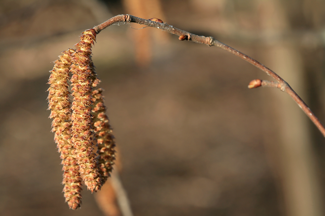 Верхняя часть побега с цветущими мужскими соцветиями. Костромская обл., Судиславский р-н, дер. Антипино. 17.04.2016.