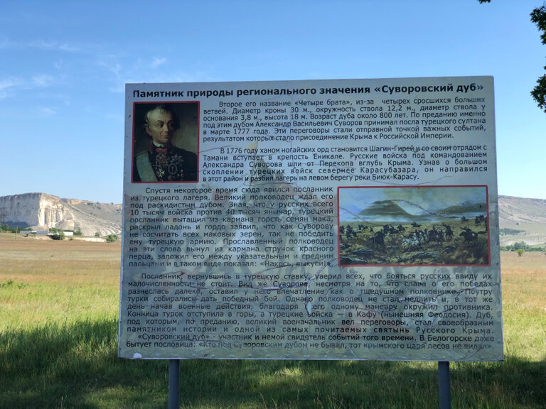 Дерево — ботанический и исторический памятник, возраст более 800 лет, диаметр ствола — 4 м, окружность ствола — 10 м, крона — 40 м. Крым, Белогорский р-н, с. Яблочное. 19.05.2013.