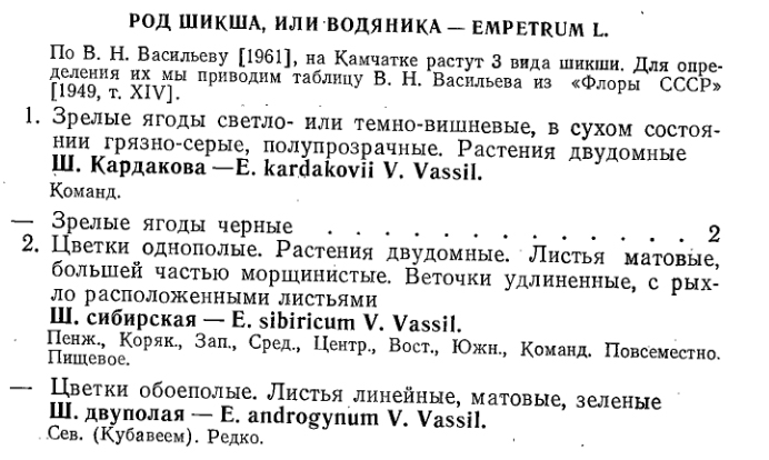 Empetraceae - Шикшевые Empetrum nigrum L. s.l. - Шикша или водяника черная. Syn.: Empetrum albidum V. Vassil.; Empetrum androgynum V. Vassil.; Empetrum sibiricum V. Vassil.; Empetrum stenopetalum Vassil.; Empetrum subholarcticum V. Vassil. Распр.: Все р-ны. Охр.: ЮКЗ, ЮКП, НП, БП, КП, КРЗ. Экол.: Шикшевники, кустарничковые тундры (на равнинах и в горах), болота, мелкобугристые луга, лиственничные и смешанные леса, стланниковые заросли, шлаковые поля, низкотравные луга (Л-А, до 1400 м над ур. м.). Адм.: Все р-ны. Прим.:Попытки определения «мелких видов» шикши по ключам Н.Н. Цвелёва (1991) приводят, как правило, к тому, что значительная часть собранного материала либо вообще не определяется, либо в равной степени может быть отнесена к двум видам. По всей видимости, на Камчатке шикша представлена не множеством самостоятельных видов, а рядом перетекающих друг в друга внутривидовых форм, принадлежащих к одному- двум полиморфным видам. |