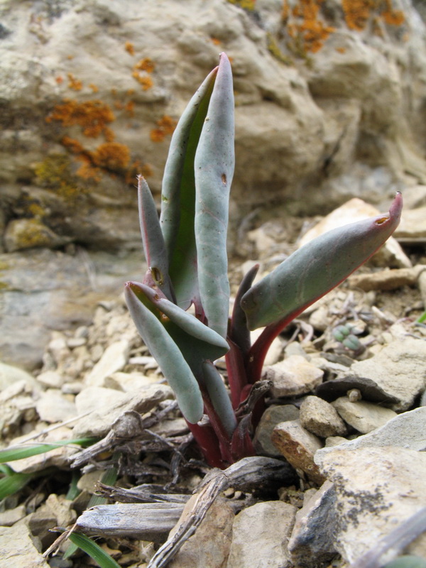 Цветущее растение в глинистом субстрате. Киргизия, Таласская обл., предгорья южного склона Киргизского хр. 6 апреля 2016 г.