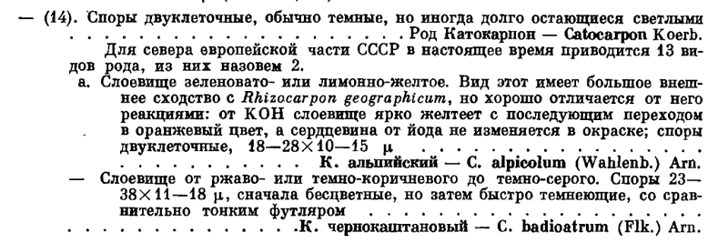 А тут нечто иное. Глянул Домбровскую и нашел там чуть раньше цитированного фрагмента пункт о котором я и говорил: 13 "апотеции между ареолами, угловатые" (альпийский, географический) и "на ареолах" (наш случай). После хождения по тезам уткнулся в Lecanora armeniaca