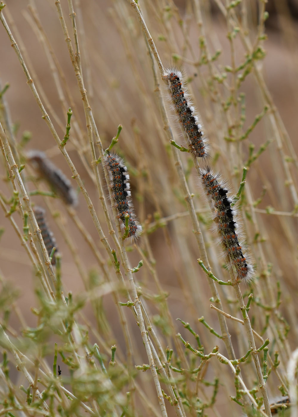 Скотину в том месте не пасут - много туристов. Могу лишь предположить, что таким образом дерево защищают от гусениц Orgyia dubia (как на прилагаемом фото, в данном случае на саксауле), которая является полифагом (хотя на лохе я ее никогда не видел). Их иногда в пустыне бывает настолько много, что мигрируя, они создают целые "реки".Марина, дерево с бутылками от скотины? |