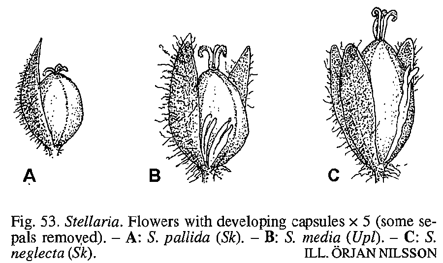Если ориентроваться на эти присланные Вами картинки, то подозреваю, что фото вида S. pallida у нас и нет. У меня крамольная мысль, что наличие лепестков, размер семян и степень их зубчатости у S. neglecta - факультативно, и зависит от условий произрастания конкретного растения, в благоприятных, или "скудных" условиях оно произрастает. Коробочки то всё равно большие. В палисаднике S. neglecta сейчас цветет с лепестками, на саге сегодня видел звездчатку подобную дожанской (без лепестков).Вот ещё иллюстрации из Flora Nordica: |