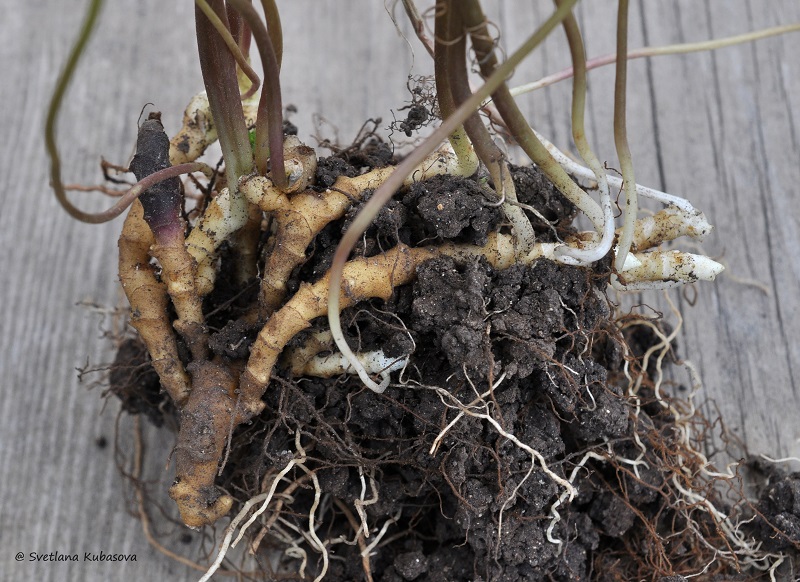Часть корневища с корнями. Свердловская обл., пгт Верхнее Дуброво, в культуре. 10.05.2017.