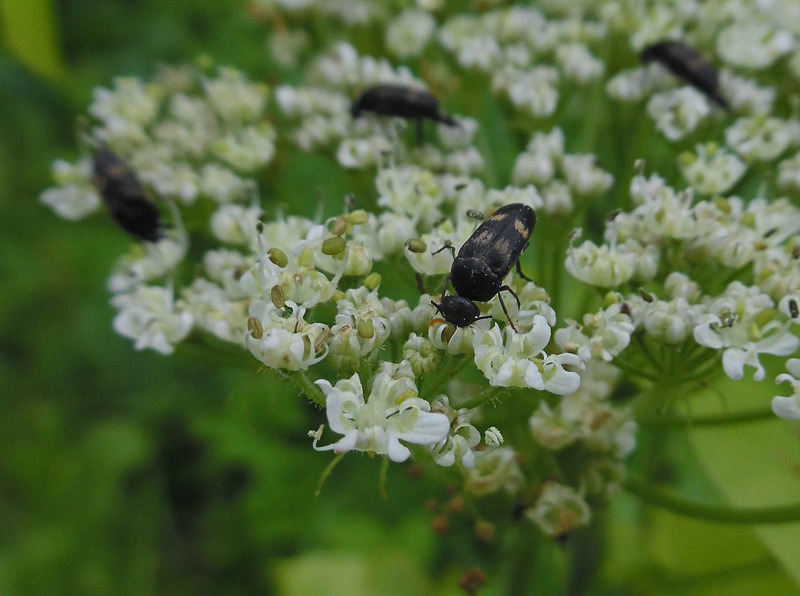 Часть раскрывающегося соцветия с питающимся жуком-горбаткой Variimorda villosa. Марий Эл, г. Йошкар-Ола, поляна в лесистой части Центрального парка. 01.08.2017.