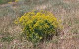 Цветущее растение в окружении злаков (на переднем плане плодоносящее Haplophyllum perforatum). Узбекистан, Ташкентская обл., Кибрайский р-н, окр. санитарно-защитной зоны. 08.06.2014.