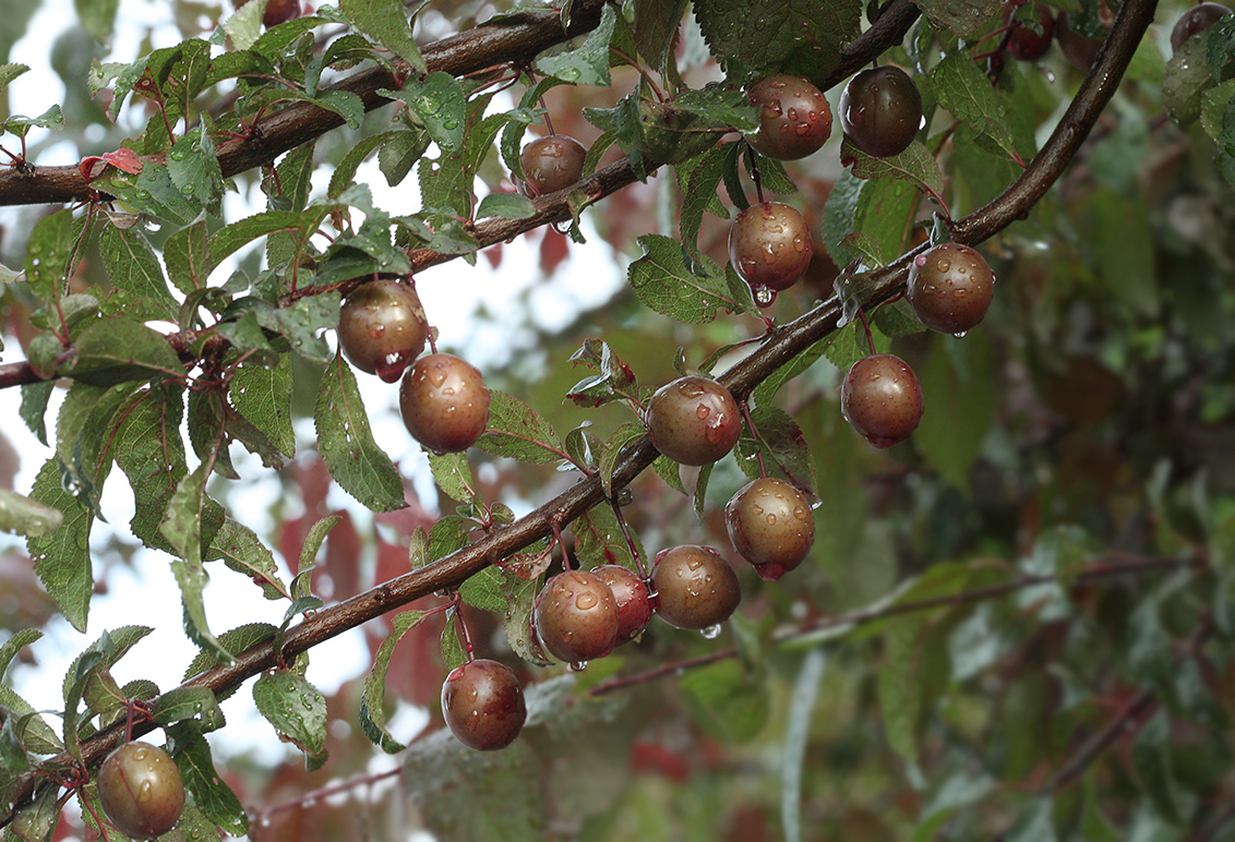 Фрагменты ветвей с незрелыми плодами в каплях дождя. Чехия, Оломоуцкий край, г. Границе, частный сад. 12.06.2017.