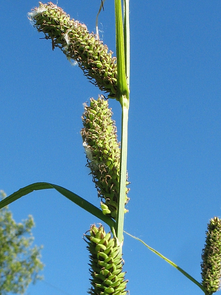 Верхушка плодоносящего растения с соплодиями и отцветшими мужскими соцветиями (вверху; Carex fuscovaginata Kuk.). Казахстан, Западный Тянь-Шань, Киргизский хр., ущ. Мерке, ≈ 1200 м н.у.м., у ирригационного арычка в приустьевой части ущелья. 25 мая 2018 г.