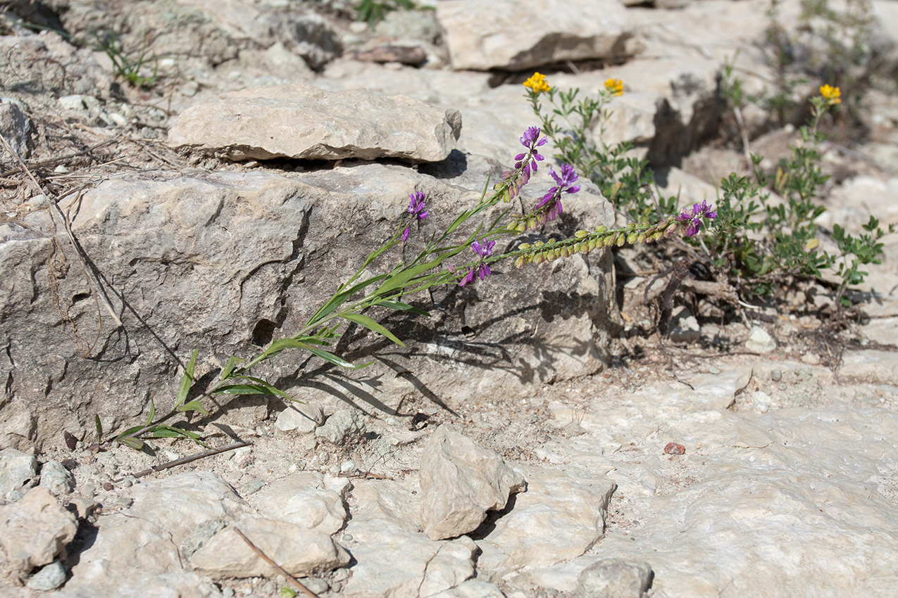 Цветущее и плодоносящее растение в скальной расщелине. Псковская обл., Псковский р-н, окр. погоста Выбуты, берег р. Великая, известняковый обрыв. 26.06.2018.
